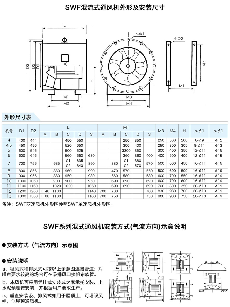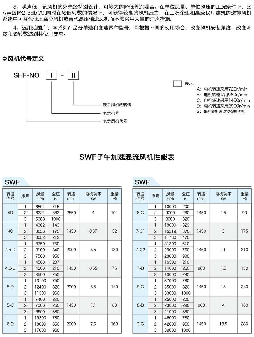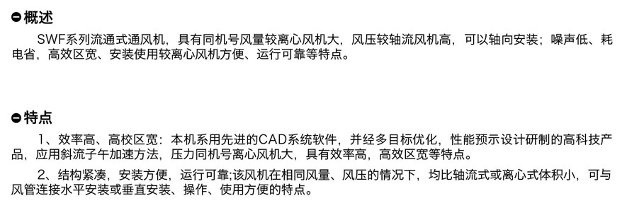 SWF系列流通式通風(fēng)機(jī),具有同機(jī)號(hào)風(fēng)置較離心風(fēng)機(jī)大,風(fēng)壓較軸流風(fēng)機(jī)高,可以軸向安裝; 噪聲低、耗 電省,高效區(qū)寬、安裝使用較離心風(fēng)機(jī)方便、運(yùn)行可靠等特點(diǎn)。